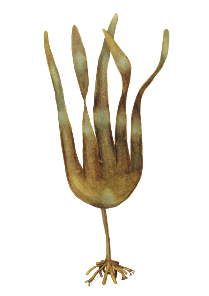 Oarweed is a large brown algae that is found growing in the North Atlantic ocean, in shallow areas where sunlight reaches the ocean floor. It’s distinctive fronds gave it its Latin name – digitata coming from digitus, meaning ‘finger’. Each frond is segmented into between 3 and 8 finger-like blades, which sprout from a thin yet dense stem which can be seen standing proud from the water’s surface during low tide. Each frond segment (or ‘finger’) can grow up to two metres long in the right conditions, and they are thick, glossy and yellow-brown in colour.