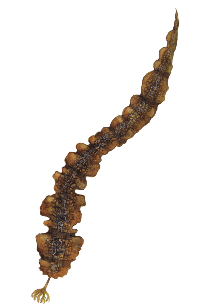 Sugar kelp has easily recognisable rippled edges and an alligator-like texture. A type of brown algae, sugar kelp is thick, golden and has fronds that rapidly grows up to four metres in length. Sugar kelp favours colder water, and is so named because of the high concentration of the natural sugar mannitol. When the fronds of kelp are dried, the mannitol crystallises into a visible white powder on the surface. Not to be mistaken for white mould – this is a sign of high quality kelp.